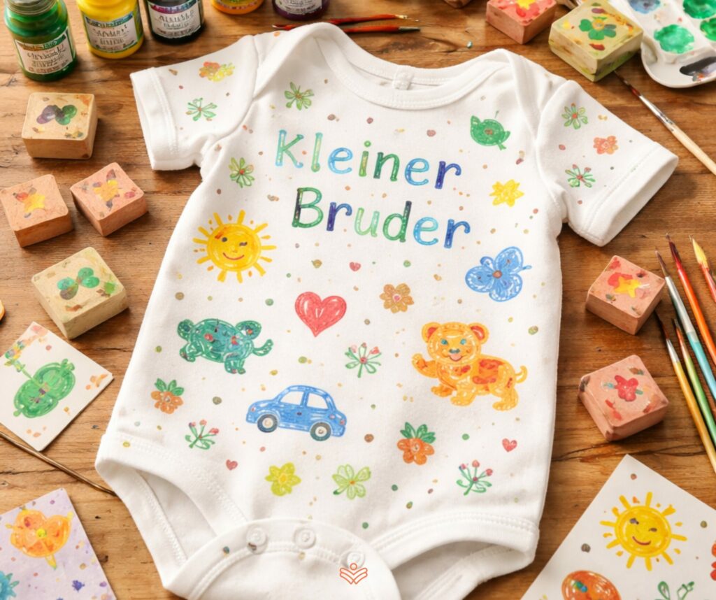 Ech erwaarden e Geschwësterchen. E Liesmoien mat Bicher, déi Kanner tëschent 4 a 7 Joer op den neie Puppelchen astëmme sollen. Fir d’Bindung ze stäerken, dekoréiere Geschwëster dem neie Bébé e Strampler.