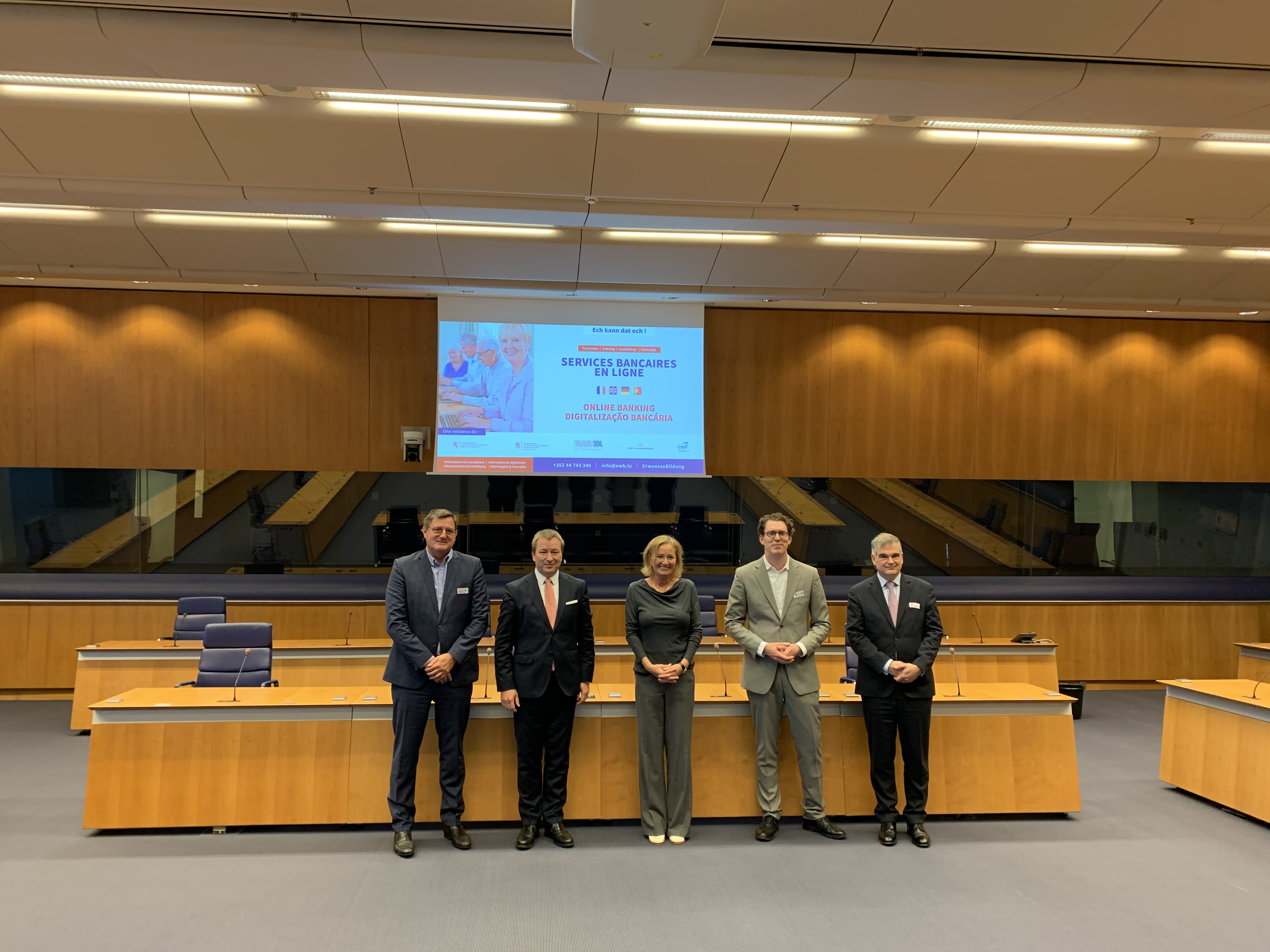 Le 21 septembre 2021, le ministre délégué à la Digitalisation, Marc Hansen, la ministre de la Protection des consommateurs, Paulette Lenert, le président de la Fondation ABBL pour l’éducation financière, Yves Maas, le directeur général de la CSSF, Claude Marx, et le président de l’ASBL ErwuesseBildung, Pit Peporté, ont présenté la nouvelle formation aux services bancaires en ligne dédiée aux seniors placée sous le titre « Ech kann dat och ».